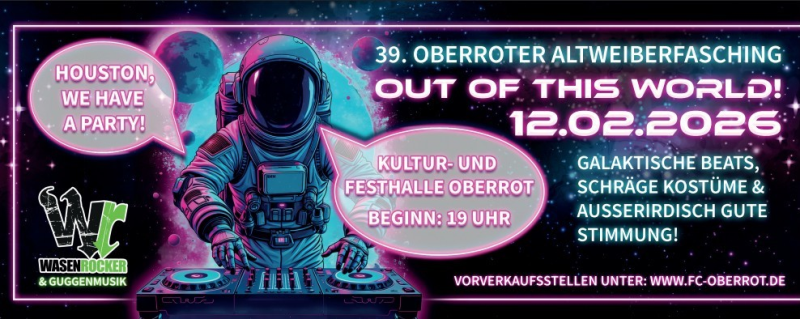 Der FC Oberrot freut sich, auf Ihre Landung im Rottal-Space-Center (Kultur- und Festhalle) am, 12. Februar 26 ab 19:00 Uhr