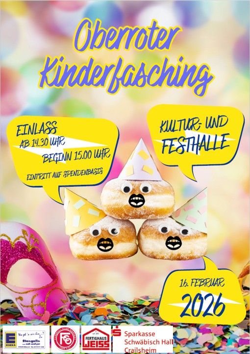 Am Rosenmontag, den 16. Februar Einlass ab 14:30 h / Beginn 15 Uhr ist in Oberrot Kinderfasching angesagt.